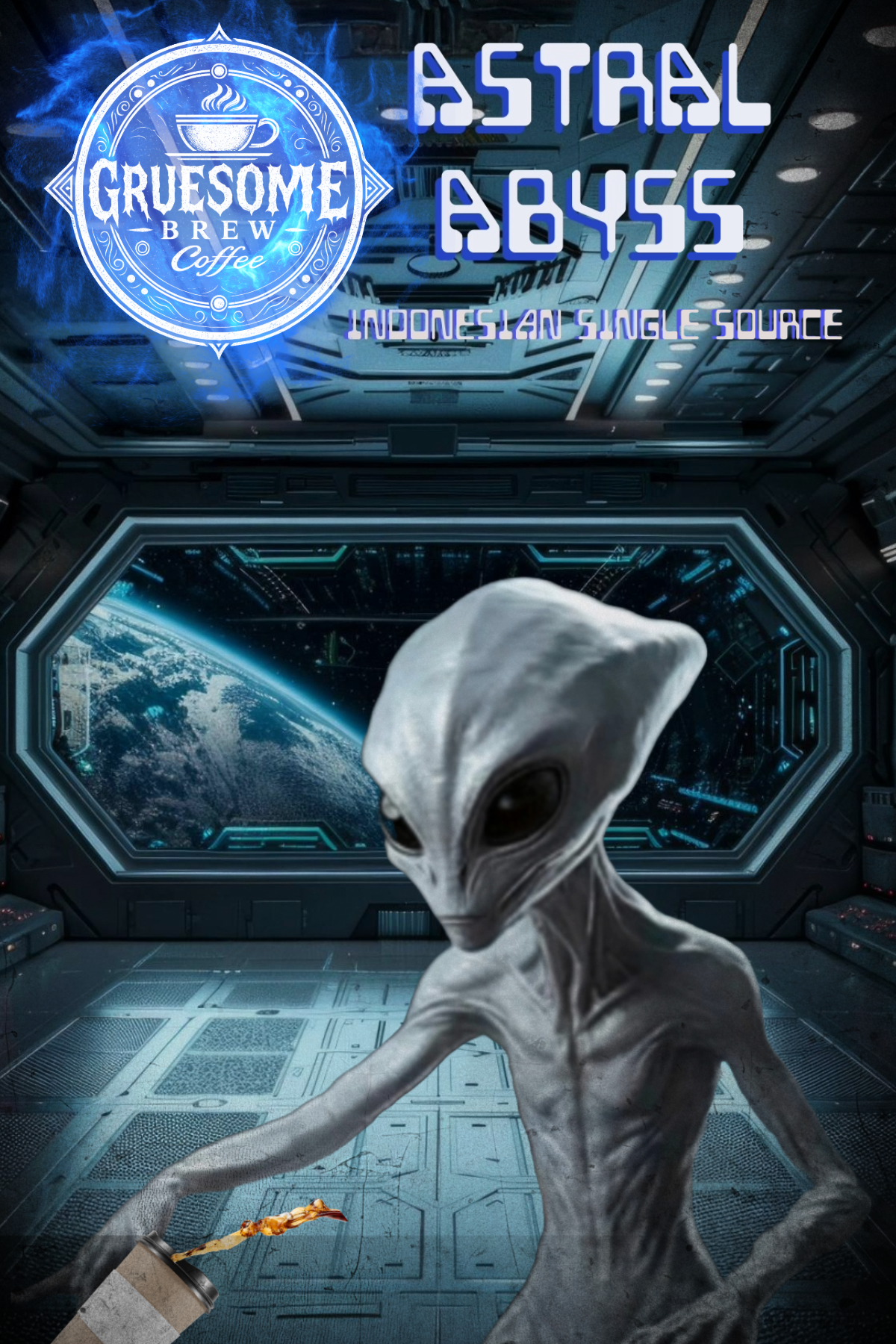 Behold "Astral Abyss," a medium-dark roast crafted by Gruesome Brew Coffee, cultivated from the enigmatic fields of Indonesia. This brew beckons with ethereal whispers of cedar and sinister undertones of dark chocolate. Crafted with arcane precision, it is a brew that tantalizes the senses and ensnares the soul. Its allure is undeniable, drawing the Greys from their starlit realms to the haunted grounds of Earth.